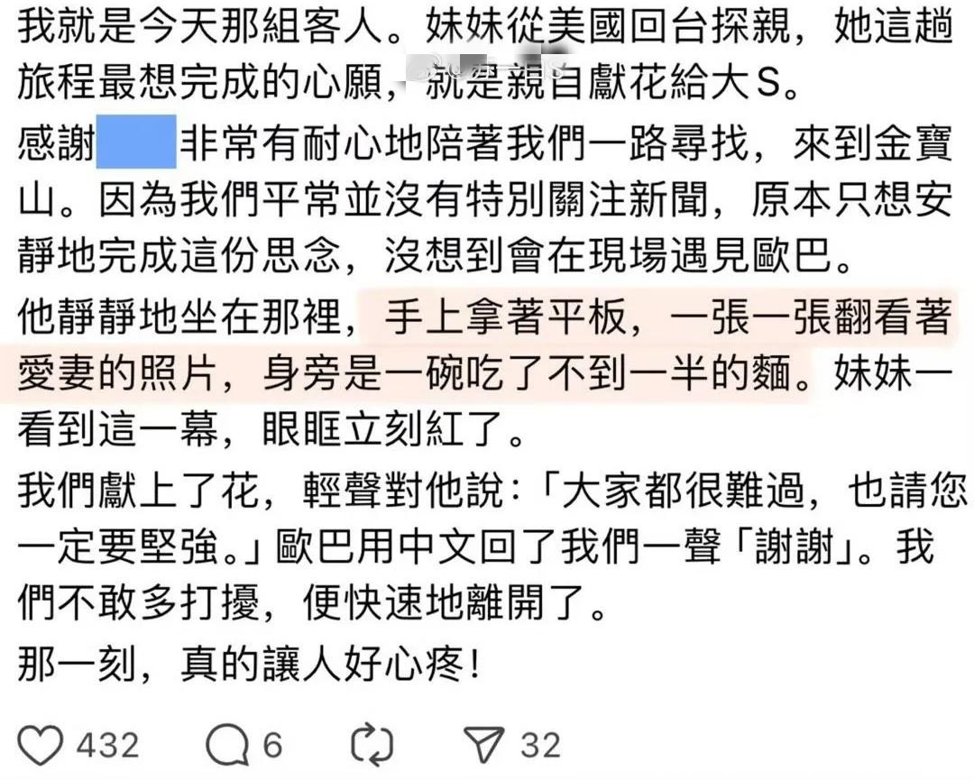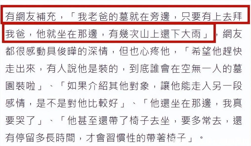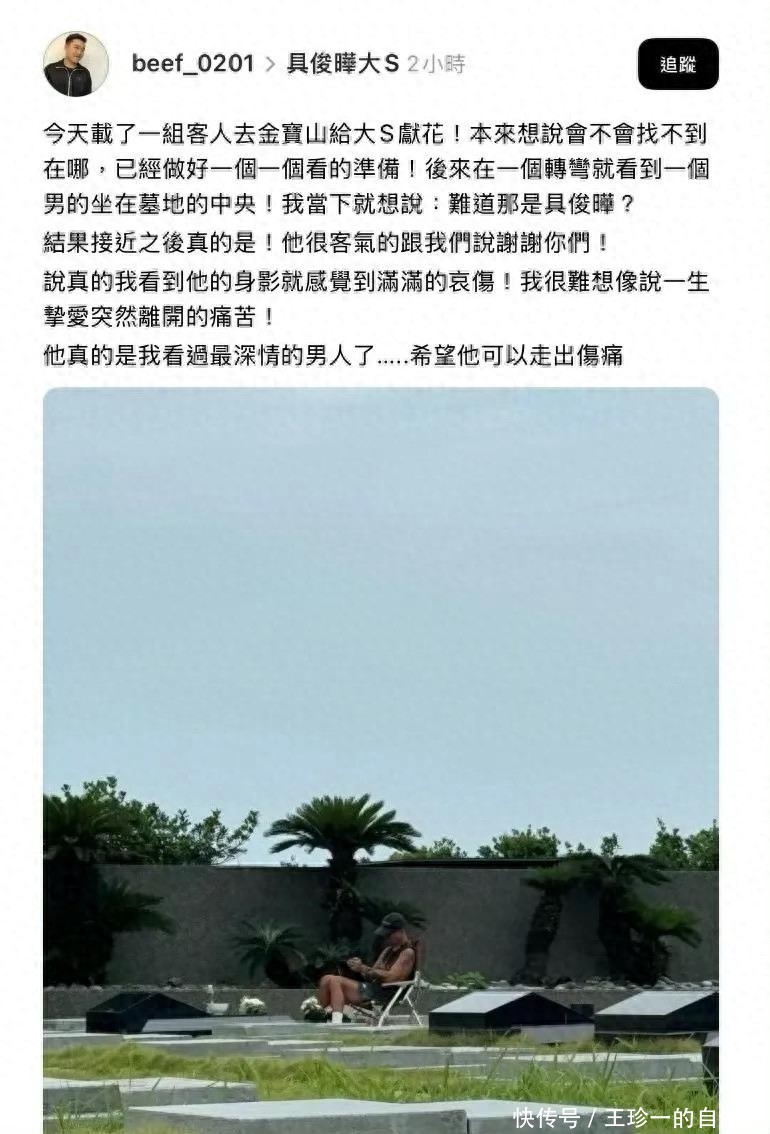 有一位台湾网友说他爸爸的墓地在大S的墓地附近,每次他去看爸爸,都能看到具俊晔坐在大S墓地旁边,甚至有几次下雨,他去墓地也看到了具俊晔。